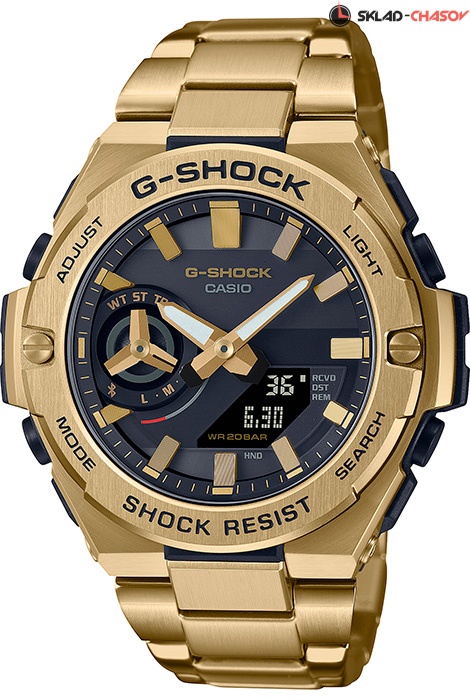 Противоударные кварцевые наручные часы на солнечной батарее Casio GST-B500GD-9A коллекции G-Shock с модулем Bluetooth Smart. Калибр механизма — 5684. Аккумулятор данной модели заряжается от любого источника света. Срок работы аккумулятора с полным зарядом — около 7-ми месяцев. Примерный срок службы аккумулятора — 10 лет. Имеется режим энергосбережение (дисплей гаснет для экономии энергии, когда часы остаются в темноте) и индикатор уровня заряда батареи. С помощью технологии Bluetooth Smart данная модель имеет возможность поддерживать связь с системами IOS и Android. Возможности Bluetooth в данной модели: c помощью специального приложения CASIO WATCHES возможно установить время в конкретном городе (300 городов), время будильника, воспользоваться секундомером, установить точное текущее время, а также в случае потери смартфона возможно воспроизвести на нем сигнал. Функциональность данной модели: отображение времени в 12-часовом или 24-часовом формате; режим сохранения энергии; индикатор уровня заряда аккумулятора; индикация даты и дня недели; возможность установки индикации дня недели на русском языке; ежедневная автоматическая корректировка точного времени по Bluetooth (4 раза в сутки); вечный календарь до 2099 года; 5 независимых будильников; сигнал начала часа; мировое время в 38 городах (38 часовых поясов); функция летнего времени (DST); секундомер с точностью 1/100 секунды и измерением до 23 часов 59 минут 59 cек.; таймер обратного отсчета до 60 минут; функция перемещения стрелок (помогает определить значения в окошке с цифровой индикацией, когда стрелки его закрывают); двойная диодная подсветка циферблата с возможностью выбора времени свечения (1.5 или 3 секунды) + необритовое (Neobrite) покрытие на стрелках для длительного послесвечения в темноте; функция поиска телефона - можно включить тоновый сигнал на телефоне, что позволит быстро найти телефон; режим выключения звука нажатия кнопок (Mute). Пластиковый корпус в оболочке из нержавеющей стали, дополнительно усиленный углеродным волокном, изготовленным по технологии Carbon Core Guard. Браслет из нержавеющей стали. На корпус и браслет нанесено стойкое PVD покрытие. Водонепроницаемость WR200 (20 атм).