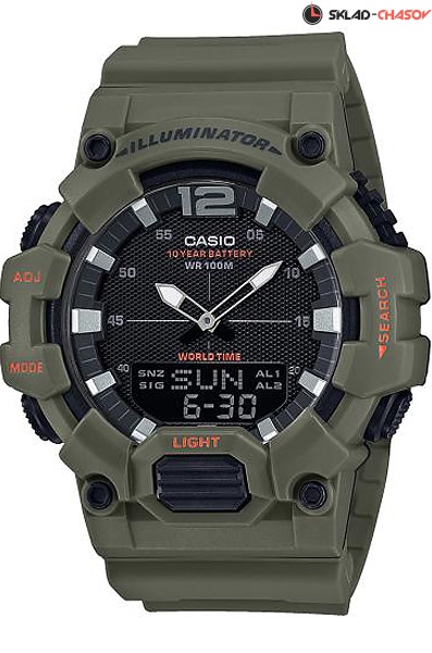 Кварцевые мужские наручные часы Casio HDC-700-3A2 с цифровой+стрелочной индикацией времени. Калибр механизма — 5565. Функциональность данной модели: формат времени 12/24, функция летнего времени (DST), мировое время 30 городов (29 часовых поясов), вечный календарь до 2099 года, 3 независимых будильника, сигнал начала часа, секундомер с точностью 1/100 секунды и измерением до 23 часов 59 минут 59,99 cек., таймер обратного отсчета (диапазон времени 24 часа), записная книжка телефонных номеров на 30 записей, диодная подсветка циферблата и люминесцентное напыление на стрелках и метках часов. Водонепроницаемость WR100 (10 атм). Батарейка на 10 лет работы.