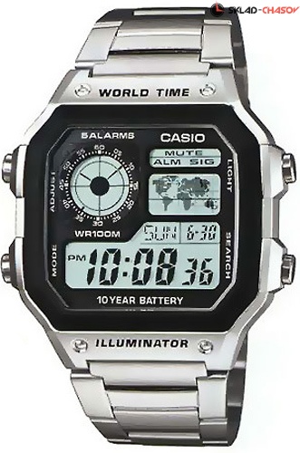 Электронные кварцевые мужские наручные часы Casio AE-1200WHD-1A с цифровой индикацией времени. Калибр механизма — 3299. Функциональность данной модели: формат времени 12/24, мировое время 48 городов (31 часовой пояс), вечный календарь до 2099 года, 5 независимых будильников, сигнал начала часа, секундомер с точностью 1/100 секунды и измерением до 23 часов 59 минут 59,99 cек., таймер обратного отсчета (диапазон времени 24 часа), функция выключения звука кнопок (Mute), диодная подсветка циферблата. Батарейка на 10 лет работы. Водонепроницаемость WR100 (10 атм).