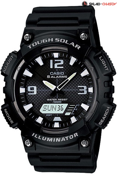 Кварцевые мужские наручные часы на солнечной батарее Casio AQ-S810W-1A с цифровой+стрелочной индикацией времени. Калибр механизма — 5208. Функциональность данной модели: режим сохранения энергии, индикатор заряда батареи, формат времени 12/24, функция летнего времени (DST), мировое время 48 городов (31 часовой пояс), вечный календарь до 2099 года, 5 независимых будильников, сигнал начала часа, секундомер с точностью 1/100 секунды и измерением до 59 минут 59,99 cек., 2 независимых таймера обратного отсчета (диапазон времени 99 минут 55 сек.), функция выключения звука кнопок (Mute), диодная подсветка циферблата и люминесцентное напыление на стрелках и метках часов. Водонепроницаемость WR100 (10 атм).