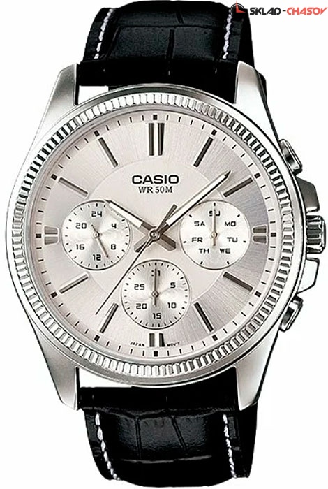Мужские кварцевые наручные часы Casio MTP-1375L-7A. Калибр механизма — 5374. На данной модели отображается дата, день недели и время суток (24-х часовая шкала). Стрелки покрыты люминесцентным напылением (светятся в темноте). Кожаный ремешок. Водонепроницаемость WR50 (5 атм).