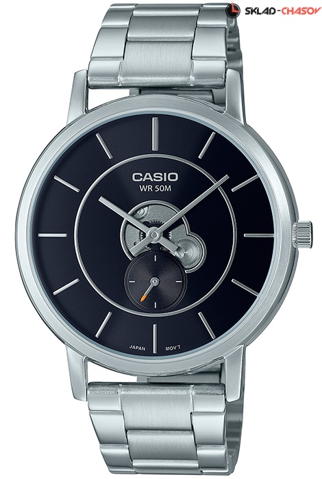 Мужские кварцевые наручные часы Casio MTP-B130D-1A. Калибр механизма — 4328. Скелетонизированный циферблат. Секундная стрелка вынесена на отдельный циферблат. Стальной браслет. Водонепроницаемость WR50 (5 атм).