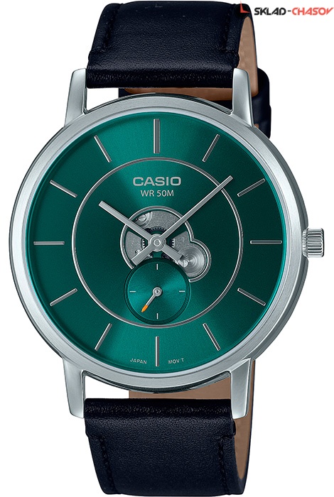 Мужские кварцевые наручные часы Casio MTP-B130L-3A. Калибр механизма — 4328. Скелетонизированный циферблат. Секундная стрелка вынесена на отдельный циферблат. Кожаный ремешок. Водонепроницаемость WR50 (5 атм).