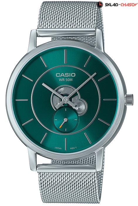 Мужские кварцевые наручные часы Casio MTP-B130M-3A. Калибр механизма — 4328. Скелетонизированный циферблат. Секундная стрелка вынесена на отдельный циферблат. Стальной браслет миланского плетения. Водонепроницаемость WR50 (5 атм).