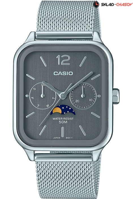Кварцевые наручные часы Casio MTP-M305M-8A. Калибр механизма — 3744. На данной модели отображается день недели, текущая дата и фаза луны. Стальной браслет миланского плетения. Водонепроницаемость WR50 (5 атм).