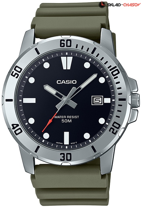 Мужские кварцевые наручные часы Casio MTP-VD01-3E. Калибр механизма — 5058. На данной модели отображается текущая дата. Стрелки и метки покрыты люминесцентным напылением (светятся в темноте). Полимерный ремешок. Водонепроницаемость WR50 (5 атм).