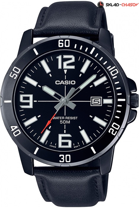 Мужские кварцевые наручные часы Casio MTP-VD01BL-1B. Калибр механизма — 5058. На данной модели отображается текущая дата. Стрелки и метки покрыты люминесцентным напылением (светятся в темноте). Кожаный ремешок. На корпус нанесено стойкое покрытие. Водонепроницаемость WR50 (5 атм).