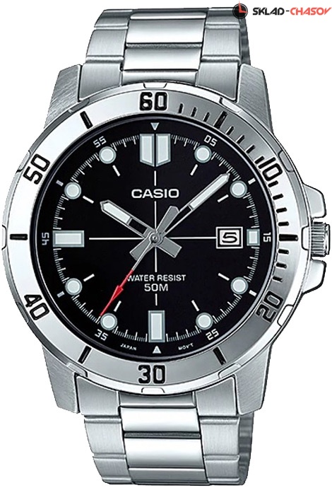 Мужские кварцевые наручные часы Casio MTP-VD01D-1E. Калибр механизма — 5058. На данной модели отображается текущая дата. Стрелки и метки покрыты люминесцентным напылением (светятся в темноте). Стальной браслет. Водонепроницаемость WR50 (5 атм).