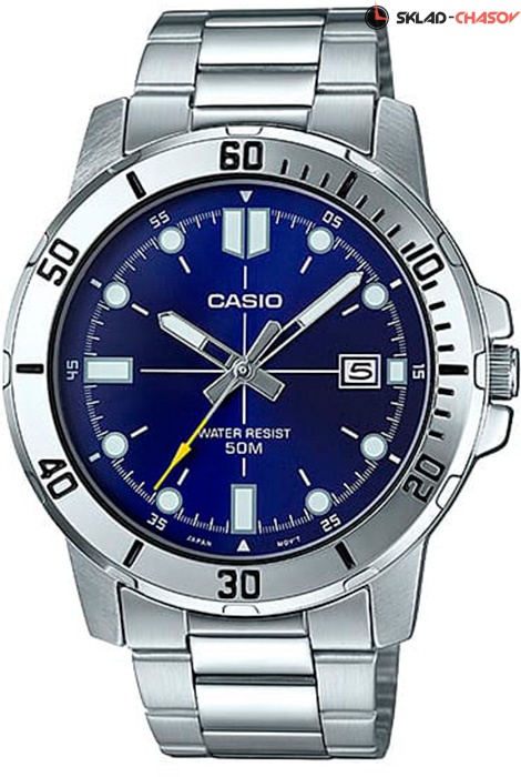 Мужские кварцевые наручные часы Casio MTP-VD01D-2E. Калибр механизма — 5058. На данной модели отображается текущая дата. Стрелки и метки покрыты люминесцентным напылением (светятся в темноте). Стальной браслет. Водонепроницаемость WR50 (5 атм).