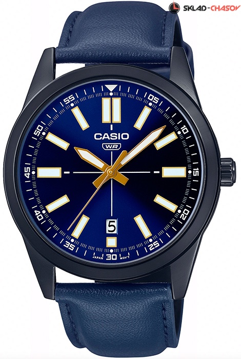 Мужские кварцевые наручные часы Casio MTP-VD02BL-2E. Калибр механизма — 5128. На данной модели отображается текущая дата. Стрелки и метки покрыты люминесцентным напылением (светятся в темноте). Кожаный ремешок. На корпус нанесено стойкое покрытие. Водонепроницаемость WR (3 атм).