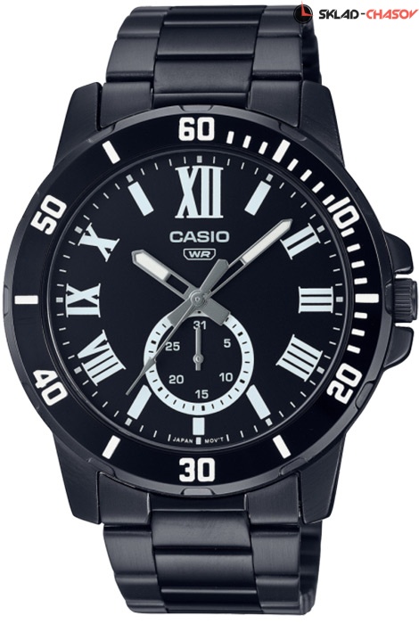 Мужские кварцевые наручные часы Casio MTP-VD200B-1B. Калибр механизма — 5614. На данной модели отображается текущая дата. Стрелки покрыты люминесцентным напылением (светятся в темноте). Стальной браслет. На корпус и браслет нанесено стойкое покрытие. Водонепроницаемость WR (3 атм).
