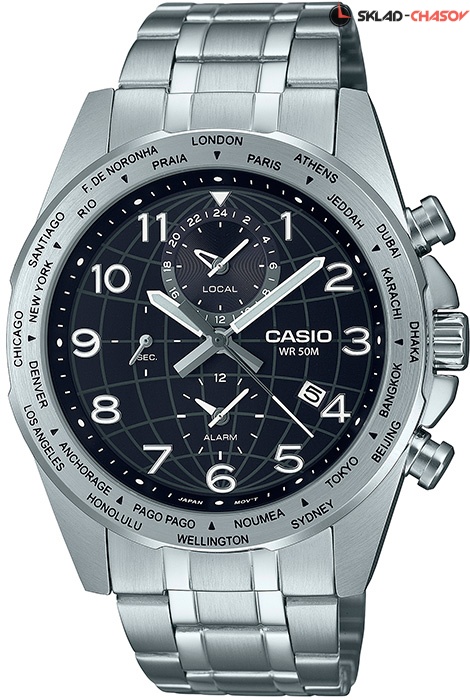 Мужские кварцевые наручные часы с мировым временем Casio MTP-W500D-1A. Калибр механизма — 5335. На данной модели отображается текущая дата. Функциональность данной модели: мировое время в 24 городах (24 часовых пояса), двойное время (24-х часовой дополнительный циферблат), будильник, индикатор низкого уровня заряда батареи. Стрелки покрыты люминесцентным напылением (светятся в темноте). Стальной браслет. Завинчивающаяся задняя крышка. Водонепроницаемость WR50 (5 атм).