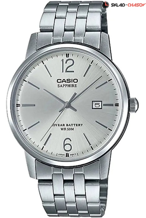 Мужские кварцевые наручные часы Casio MTS-110D-7A. Калибр механизма — 2719. На данной модели отображается дата. Сапфировое стекло. Стальной браслет. Водонепроницаемость WR50 (5 атм).