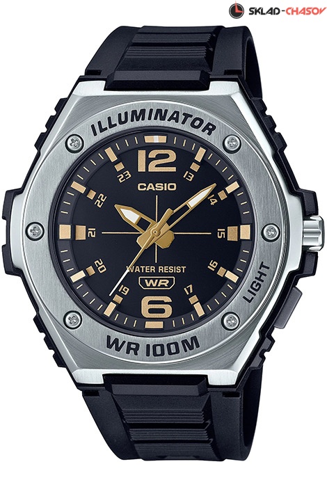 Мужские кварцевые наручные часы Casio MWA-100H-1A2. Калибр механизма — 5577. Диодная подсветка циферблата. Стрелки покрыты люминесцентным напылением (светятся в темноте). Полимерный ремешок. Водонепроницаемость WR100 (10 атм).
