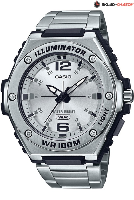 Мужские кварцевые наручные часы Casio MWA-100HD-7A. Калибр механизма — 5577. Диодная подсветка циферблата. Стрелки покрыты люминесцентным напылением (светятся в темноте). Стальной браслет. Водонепроницаемость WR100 (10 атм).