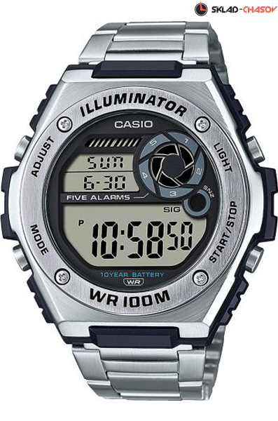 Электронные кварцевые мужские наручные часы Casio MWD-100HD-1A с цифровой индикацией времени. Калибр механизма — 3487. Функциональность данной модели: формат времени 12/24; двойное время; вечный календарь до 2099 года; 5 независимых будильников; сигнал начала часа; секундомер с точностью 1/100 секунды и измерением до 23 часов 59 минут 59,99 cек.; таймер обратного отсчета (диапазон времени 24 часа); диодная подсветка циферблата с функцией послесвечения. Батарейка на 10 лет работы. Водонепроницаемость WR100 (10 атм).