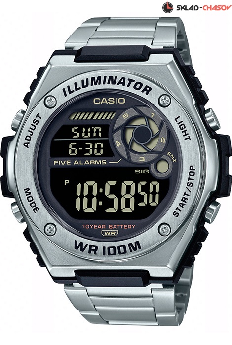 Электронные кварцевые мужские наручные часы Casio MWD-100HD-1B с цифровой индикацией времени. Калибр механизма — 3487. Функциональность данной модели: формат времени 12/24; двойное время; вечный календарь до 2099 года; 5 независимых будильников; сигнал начала часа; секундомер с точностью 1/100 секунды и измерением до 23 часов 59 минут 59,99 cек.; таймер обратного отсчета (диапазон времени 24 часа); диодная подсветка циферблата с функцией послесвечения. Батарейка на 10 лет работы. Водонепроницаемость WR100 (10 атм).