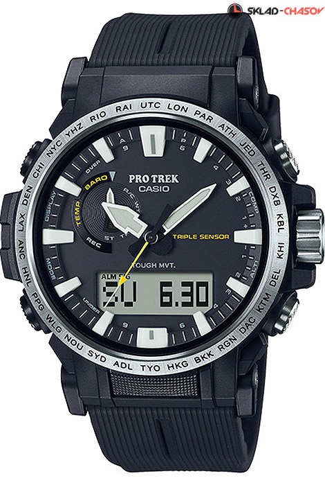 Многофункциональные наручные часы с компасом, термометром, барометром и высотомером Casio PRW-61-1A коллекции Pro Trek на солнечной батарее. Калибр механизма — 5673. Аккумулятор данной модели заряжается от любого источника света. Срок работы аккумулятора с полным зарядом — около 6-ти месяцев. Примерный срок службы аккумулятора — 10 лет. Имеется режим энергосбережения (дисплей гаснет, а стрелки останавливаются для экономии энергии, когда часы остаются в темноте) и индикатор уровня заряда батареи. Технология Smart Access, удобная заводная головка, которая ускоряет процесс настройки необходимых функций. Функциональность данной модели: радиоконтроль точного времени (Wave Ceptor); барометр c построением графика атмосферного давления (измерения каждые 30 минут или 2 часа); цифровой компас; альтиметр с памятью на 30 записей (в памяти может быть сохранено до 30 записей, содержащих информацию о дате/времени, направлении, атмосферном давлении, высоте, температуре) диапазон измерения: –700 – 10 000 м. с построением графика набора высоты; термометр (диапазон измерения и отображения: –10,0–60,0°C); режим сохранения энергии; индикатор заряда батареи; формат времени 12/24; функция летнего времени (DST); мировое время 29 городов (29 часовых поясов); вечный календарь до 2099 года; 5 независимых будильников; сигнал начала часа; секундомер с точностью 1/100 секунды и измерением до 23 часов 59 минут 59,99 cек.; таймер обратного отсчета (диапазон времени 60 минут); двойная диодная подсветка циферблата с функцией авто (включается при наклоне часов на 40°) и возможностью выбора времени свечения (1.5 или 3 секунды) + необритовое (Neobrite) покрытие на стрелках и метках для длительного послесвечения в темноте; функция выключения звука нажатия кнопок (Mute); функция перемещения стрелок (помогает определить значения в окошке с цифровой индикацией, когда стрелки его закрывают). Завинчивающаяся заводная головка. Корпус из нержавеющей стали и пластика. Полимерный ремешок. Устойчивость к низким температурам (до -10?/14?). Водонепроницаемость WR100 (10 атм).