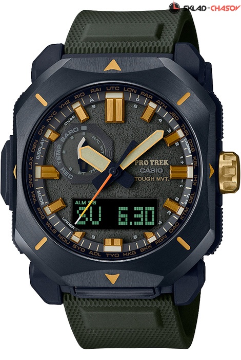 Многофункциональные наручные часы с компасом, термометром, барометром и высотомером Casio PRW-6900Y-3E коллекции Pro Trek на солнечной батарее. Калибр механизма — 5673. Аккумулятор данной модели заряжается от любого источника света. Срок работы аккумулятора с полным зарядом — около 6-ти месяцев. Примерный срок службы аккумулятора — 10 лет. Имеется режим энергосбережения (дисплей гаснет, а стрелки останавливаются для экономии энергии, когда часы остаются в темноте) и индикатор уровня заряда батареи. Технология Smart Access, удобная заводная головка, которая ускоряет процесс настройки необходимых функций. Функциональность данной модели: радиоконтроль точного времени (Wave Ceptor); барометр c построением графика атмосферного давления (измерения каждые 30 минут или 2 часа); цифровой компас; альтиметр с памятью на 30 записей (в памяти может быть сохранено до 30 записей, содержащих информацию о дате/времени, направлении, атмосферном давлении, высоте, температуре) диапазон измерения: –700 – 10 000 м. с построением графика набора высоты; термометр (диапазон измерения и отображения: –10,0–60,0°C); режим сохранения энергии; индикатор заряда батареи; формат времени 12/24; функция летнего времени (DST); мировое время 29 городов (29 часовых поясов); вечный календарь до 2099 года; 5 независимых будильников; сигнал начала часа; секундомер с точностью 1/100 секунды и измерением до 23 часов 59 минут 59,99 cек.; таймер обратного отсчета (диапазон времени 60 минут); двойная диодная подсветка циферблата с функцией авто (включается при наклоне часов на 40°) и возможностью выбора времени свечения (1.5 или 3 секунды) + необритовое (Neobrite) покрытие на стрелках и метках для длительного послесвечения в темноте; функция выключения звука нажатия кнопок (Mute); функция перемещения стрелок (помогает определить значения в окошке с цифровой индикацией, когда стрелки его закрывают). Завинчивающаяся заводная головка. Корпус из нержавеющей стали. На корпус нанесено стойкое PVD покрытие. Текстурированный циферблат. Полимерный ремешок. Устойчивость к низким температурам (до -10?/14?). Водонепроницаемость WR100 (10 атм).