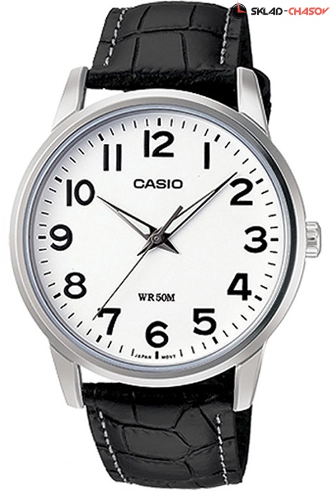 Мужские кварцевые наручные часы Casio MTP-1303L-7B. Калибр механизма — 1330. Стрелки покрыты люминесцентным напылением (светятся в темноте). Кожаный ремешок. Водонепроницаемость WR50 (5 атм).