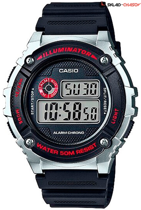 Электронные кварцевые мужские наручные часы Casio W-216H-1C с цифровой индикацией времени. Калибр механизма — 3435. Функциональность данной модели: формат времени 12/24, автоматический календарь с установкой 28 дней на февраль, будильник, сигнал начала часа, секундомер с точностью 1/100 секунды и измерением до 59 минут 59,99 cек., диодная подсветка циферблата. Водонепроницаемость WR50 (5 атм).