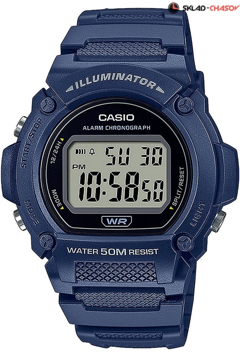 Электронные кварцевые наручные часы Casio W-219H-2A с цифровой индикацией времени. Калибр механизма — 3224. Функциональность данной модели: формат времени 12/24, вечный календарь до 2099 года, будильник, сигнал начала часа, секундомер с точностью 1/100 секунды и измерением до 59 минут 59,99 cек., диодная подсветка циферблата. Водонепроницаемость WR50 (5 атм).