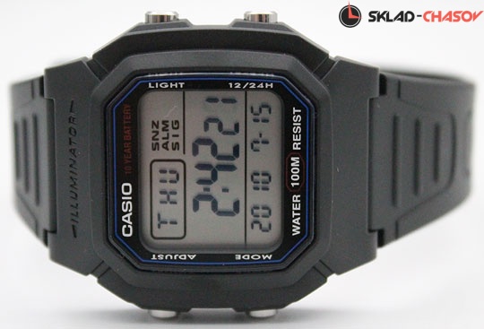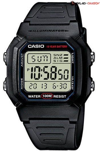 Электронные кварцевые мужские наручные часы Casio W-800H-1A с цифровой индикацией времени. Калибр механизма — 3240. Функциональность данной модели: формат времени 12/24, вечный календарь до 2099 года, многофункциональный будильник, сигнал начала часа, секундомер с точностью 1/100 секунды и измерением до 23 часов 59 минут 59,99 cек., функция двойного времени, диодная подсветка циферблата. Батарейка на 10 лет работы.