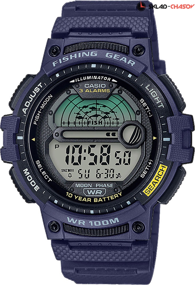 Эти часы станут прекрасным подарком для любителя рыбалки, они всегда подскажут самое удачное время для тихой охоты. Collection Out Gear. Циферблат подсвечивается светодиодом. Цвет подсветки: оранжевый. Второй часовой пояс. Индикатор рыбалки - определяет время, наиболее подходящего для рыбалки. На экране отображаются символы в виде рыбы в том случае, если время идеально подходит для рыбалки. Отображение возраста и фазы Луны. 12-ти и 24-х часовой формат времени. Секундомер с точностью показаний 1/100с и временем измерения 24ч. SPLIT-хронограф. Таймер обратного отсчета от 1мин до 24ч с автоповтором. Функция включения/отключения звука. Типы сигналов: ежедневный, ежемесячный, каждый день определенного месяца, на определенную дату. Батарея рассчитана на 10 лет. Ремешок из полимерного материала.
