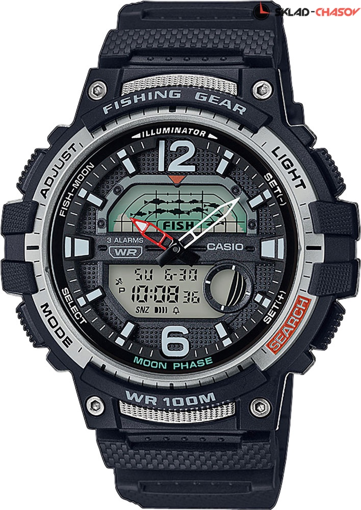 Не знаете что подарить для любителя рыбалки? Эти часы с индикатором рыбалки станут идеальным вариантом! Collection Out Gear. Циферблат подсвечивается светодиодом. Цвет подсветки: оранжевый. Второй часовой пояс отображается на цифровом дисплее. Индикатор рыбалки - определяет время, наиболее подходящего для рыбалки. На экране отображаются символы в виде рыбы в том случае, если время идеально подходит для рыбалки. Отображение возраста и фазы Луны. 12-ти и 24-х часовой формат времени. Секундомер с точностью показаний 1/100с и временем измерения 24ч. SPLIT-хронограф. Таймер обратного отсчета от 1мин до 24ч с автоповтором. Функция включения/отключения звука. Типы сигналов: ежедневный, ежемесячный, каждый день определенного месяца, на определенную дату. Ремешок из полимерного материала.