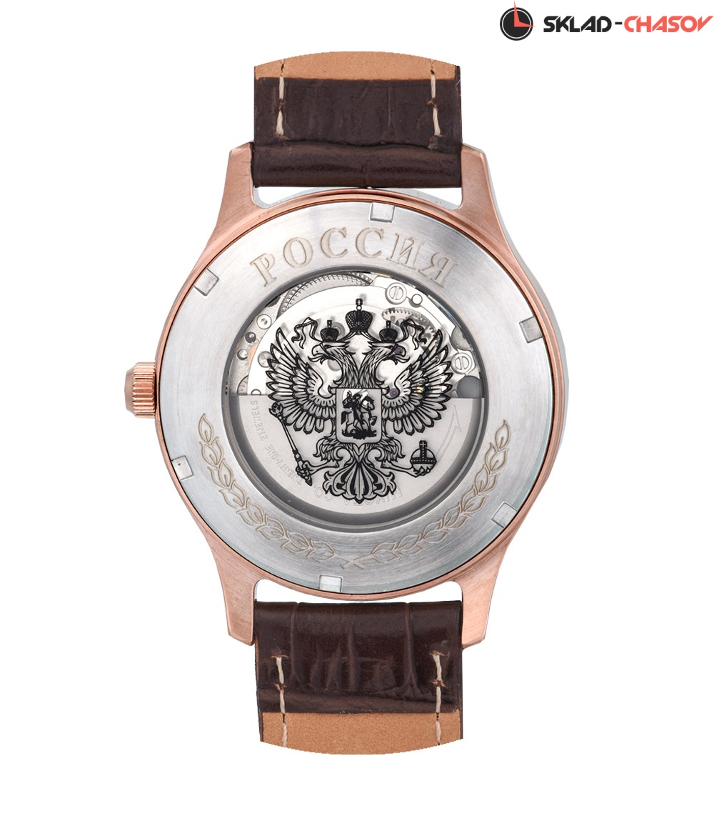 Корпус часов из высококачественной стали. Шлифованная поверхность покрыта "розовой" позолотой. Стальная задняя крышка часов – имеет вставку из минерального стекла, через которую можно наблюдать за работой автоматического механизма японского производства.