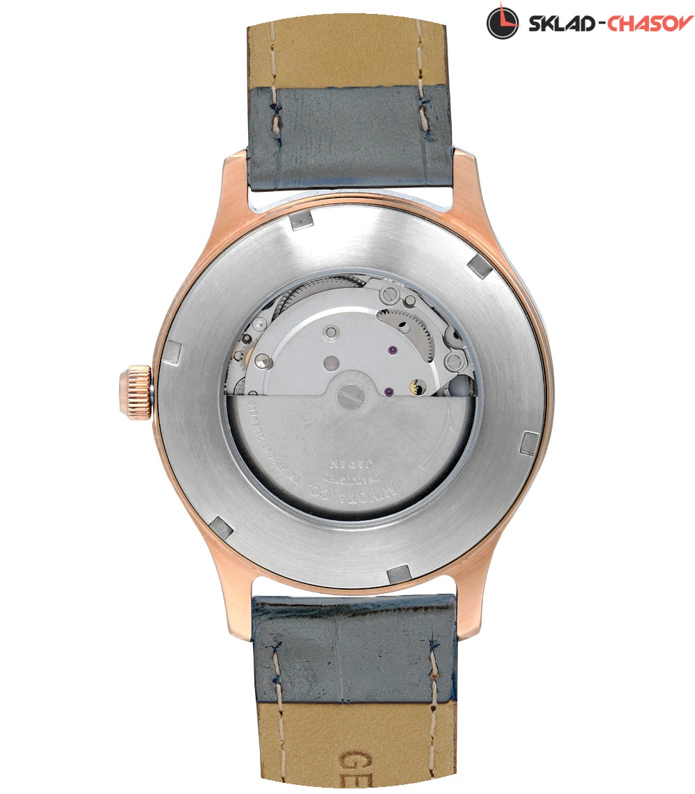 Шлифованная поверхность стального корпуса покрыта розовой позолотой. Задняя крышка часов – стальная, и имеет вставку из минерального стекла, через которую можно наблюдать за работой автоматического механизма японского производства. Стрелки и часовые знаки покрыты светомассой, что позволяет использовать часы в темное время.