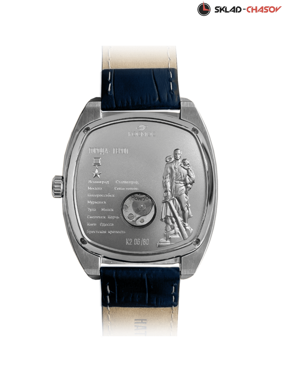 На задней крышке часов выгравированы имена 12 городов-героев и Брестской крепости, которая первой почувствовала агрессию захватчиков. Еще одна гравировка, украшающая заднюю крышку — памятник воину-освободителю, держащему на руках маленькую немецкую девочку, символ освобождения народов Европы от нацизма.