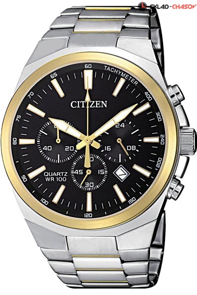 Мужские кварцевые наручные часы с хронографом (секундомером) Citizen AN8174-58E коллекции Basic. Калибр механизма — 0520. На данной модели отображается дата и время суток (24-х часовая шкала). Секундомер может отсчитывать до 59 минут 59 сек. Стрелки покрыты люминесцентным напылением (светятся в темноте). На циферблате присутствует шкала тахиметра для измерения средней скорости движения. На корпус и браслет частично нанесено стойкое PVD покрытие. Водонепроницаемость WR100 (10 атм).