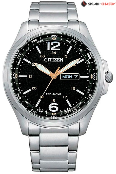 Мужские кварцевые наручные часы на солнечной батарее Citizen AW0110-82E коллекции Eco-Drive. Калибр механизма — J800. Аккумулятор данной модели заряжается от любого источника света. Срок работы аккумулятора с полным зарядом — до 240 дней. Примерный срок службы аккумулятора — 10 лет. Присутствует функция информирования о недостаточном заряде и функция предотвращения перезарядки. На данной модели отображается день недели и текущая дата. На циферблате имеется шкала солнечного компаса (Азимут). Стрелки и метки покрыты люминесцентным напылением (светятся в темноте). Стальной браслет. Завинчивающаяся задняя крышка. Водонепроницаемость WR100 (10 атм).