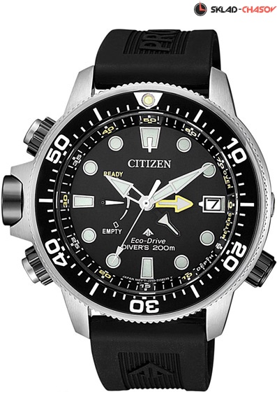Мужские кварцевые часы на солнечной батарее Citizen BN2036-14E с глубиномером коллекции Eco-Drive Promaster Aqualand. Калибр механизма — J250. Аккумулятор данной модели заряжается от любого источника света. Срок работы аккумулятора с полным зарядом — 330 дней. Примерный срок службы аккумулятора — 10 лет. Присутствует функция информирования о недостаточном заряде и функция предотвращения перезаряда. Данная модель имеет индикатор глубины погружения (до 70 метров), указатель максимальной глубины погружения с памятью и сигнал предупреждения о быстром всплытии. На данной модели отображается текущая дата. Стрелки и метки покрыты люминесцентным напылением (светятся в темноте). Данная модель обладает высокой степенью водонепроницаемости WR200 (20 атм), подходит для глубокого погружения под воду и соответствует стандарту дайверских часов ISO 6425. Завинчивающаяся заводная головка и задняя крышка для более уверенной водонепроницаемости часов. Вращающийся однонаправленный безель. На корпус частично нанесено стойкое PVD покрытие. Полимерный ремешок.