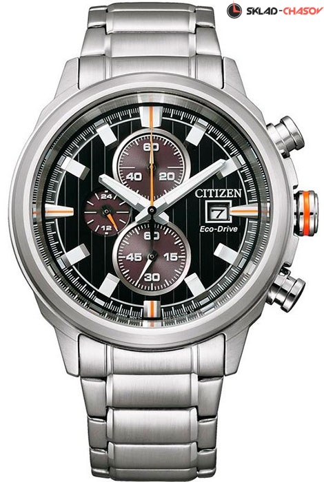 Мужские кварцевые часы с хронографом (секундомером) Citizen CA0730-85E коллекции Eco-Drive Chrono. Калибр механизма — B612. Аккумулятор данной модели заряжается от любого источника света. Срок работы аккумулятора с полным зарядом — 210 дней. Примерный срок службы аккумулятора — 10 лет. Присутствует функция информирования о недостаточном заряде. На данной модели отображается дата и время суток (24-х часовая шкала). Секундомер может отсчитывать до 59 минут 59 сек. с точностью 1/5 секунды. Стрелки и метки покрыты люминесцентным напылением (светятся в темноте). Стальной браслет. Завинчивающаяся задняя крышка. Водонепроницаемость WR100 (10 атм).