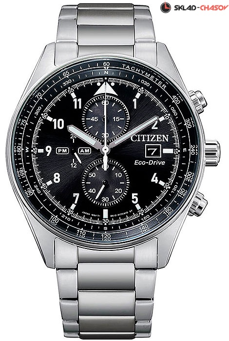 Мужские кварцевые часы с хронографом (секундомером) Citizen CA0770-81E коллекции Eco-Drive Chrono. Калибр механизма — B612. Аккумулятор данной модели заряжается от любого источника света. Срок работы аккумулятора с полным зарядом — 210 дней. Примерный срок службы аккумулятора — 10 лет. Присутствует функция информирования о недостаточном заряде. На данной модели отображается дата и время суток (24-х часовая шкала). Секундомер может отсчитывать до 59 минут 59 сек. с точностью 1/5 секунды. На циферблате присутсвует шкала тахиметра и шкала солнечного компаса (Азимут). Стрелки и метки покрыты люминесцентным напылением (светятся в темноте). Завинчивающаяся задняя крышка. Водонепроницаемость WR100 (10 атм).
