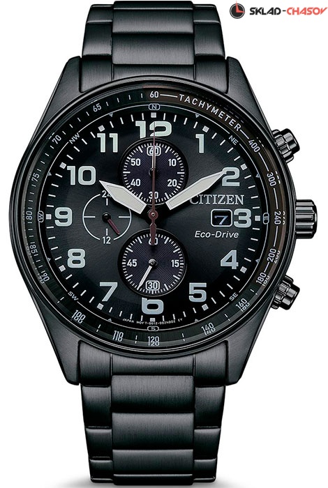 Мужские кварцевые часы с хронографом (секундомером) Citizen CA0775-79E коллекции Eco-Drive Chrono. Калибр механизма — B612. Аккумулятор данной модели заряжается от любого источника света. Срок работы аккумулятора с полным зарядом — 210 дней. Примерный срок службы аккумулятора — 10 лет. Присутствует функция информирования о недостаточном заряде. На данной модели отображается дата и время суток (24-х часовая шкала). Секундомер может отсчитывать до 59 минут 59 сек. с точностью 1/5 секунды. На циферблате присутсвует шкала тахиметра и шкала солнечного компаса (Азимут). Стрелки и метки покрыты люминесцентным напылением (светятся в темноте). Завинчивающаяся задняя крышка. На корпус и браслет нанесено стойкое PVD покрытие. Водонепроницаемость WR100 (10 атм).