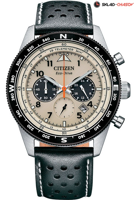 Мужские кварцевые часы с хронографом (секундомером) Citizen CA4559-13A коллекции Eco-Drive Chrono. Калибр механизма — B620. Аккумулятор данной модели заряжается от любого источника света. Срок работы аккумулятора с полным зарядом — 270 дней. Примерный срок службы аккумулятора — 10 лет. Присутствует функция информирования о недостаточном заряде. На данной модели отображается дата и время суток (24-х часовая шкала). Секундомер может отсчитывать до 60 минут с точностью 1/5 секунды. Стрелки и метки покрыты люминесцентным напылением (светятся в темноте). На безеле присутсвует шкала солнечного компаса (Азимут). Кожаный ремешок. Завинчивающаяся задняя крышка. На корпус частично нанесено стойкое PVD покрытие. Водонепроницаемость WR100 (10 атм).