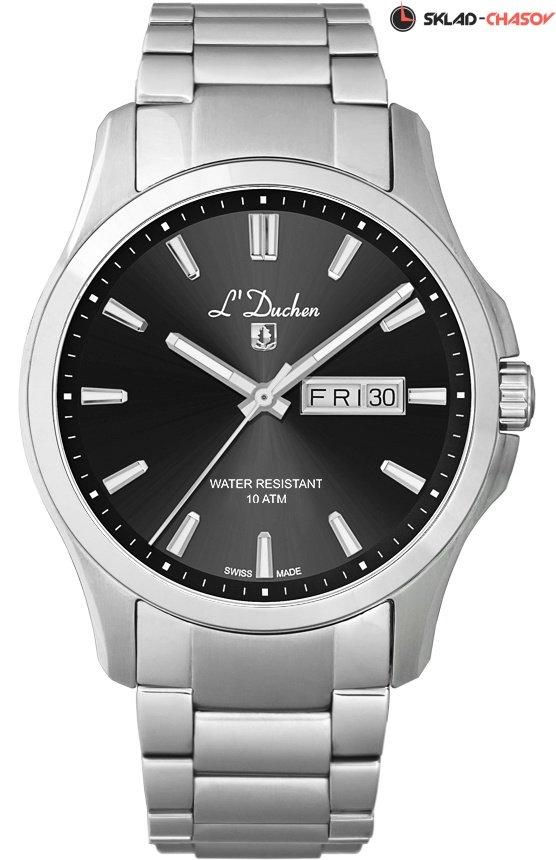 Классические часы со спортивным характером – перед вами новая модель серии Dynamique в кварцевым механизмом Ronda. Ее корпус сделан из нержавеющей стали с гипоаллергенными свойствами. Матирование подчеркивает сложную конструкцию корпуса, в которой предусмотрена дополнительная защита для рельефной заводной головки. Черный циферблат украшен полировкой в виде солнечных лучей, исходящих из центра. Стрелки часов и минут и риски с люминесцентным покрытием Superluminova позволяют легко определить время даже в темноте. Окошко даты и дня недели визуально выделено стальной окантовкой. Циферблат часов защищен сапфировым стеклом. Повышенная водостойкость составляет 10 атмосфер. Браслет модели состоит из литых стальных звеньев, на него установлена удобная в использовании застежка-клипса с логотипом бренда L’Duchen. Эти часы – надежный и стильный аксессуар, который будет уместен в любой ситуации: и на деловой встрече, и на дружеской вечеринке.