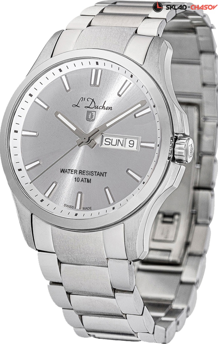 Классические часы со спортивным характером – перед вами новая модель серии Dynamique в кварцевым механизмом Ronda. Ее корпус сделан из нержавеющей стали с гипоаллергенными свойствами. Матирование подчеркивает сложную конструкцию корпуса, в которой предусмотрена дополнительная защита для рельефной заводной головки. Белый циферблат украшен полировкой в виде солнечных лучей, исходящих из центра. Стрелки часов и минут и риски с люминесцентным покрытием Superluminova позволяют легко определить время даже в темноте. Окошко даты и дня недели визуально выделено стальной окантовкой. Циферблат часов защищен сапфировым стеклом. Повышенная водостойкость составляет 10 атмосфер. Браслет модели состоит из литых стальных звеньев, на него установлена удобная в использовании застежка-клипса с логотипом бренда L’Duchen. Эти часы – надежный и стильный аксессуар, который будет уместен в любой ситуации: и на деловой встрече, и на дружеской вечеринке.