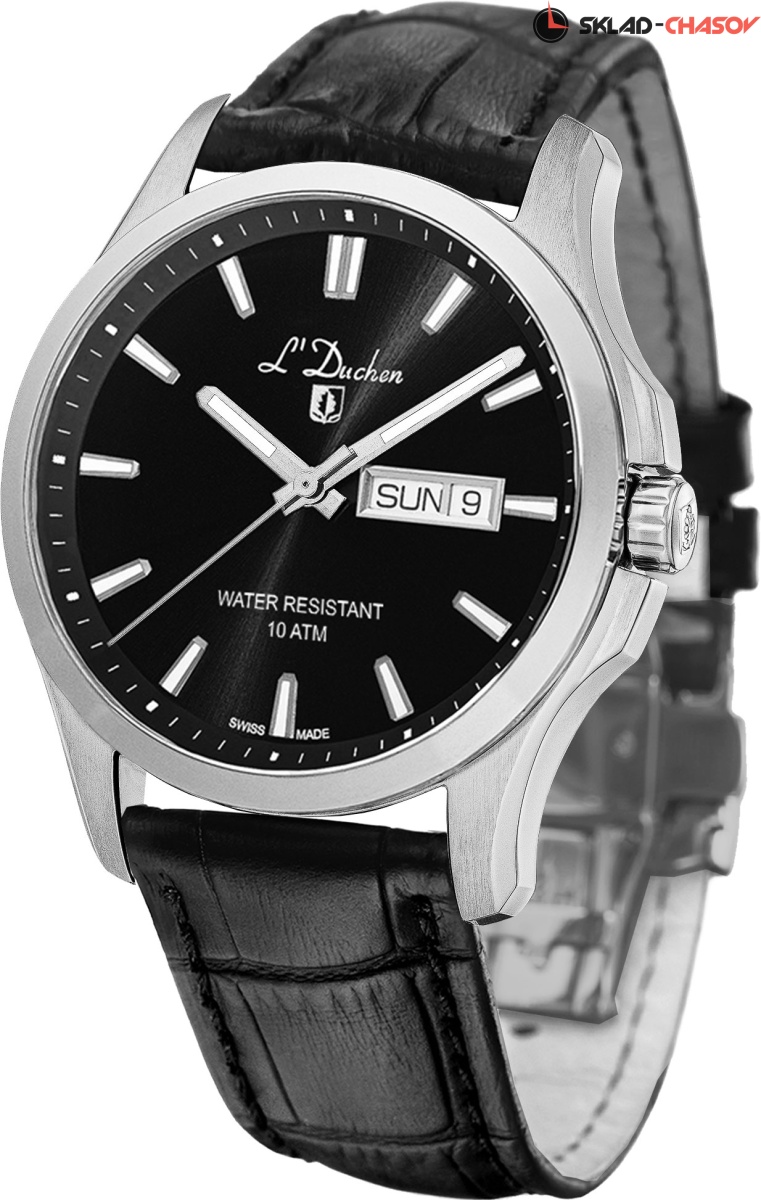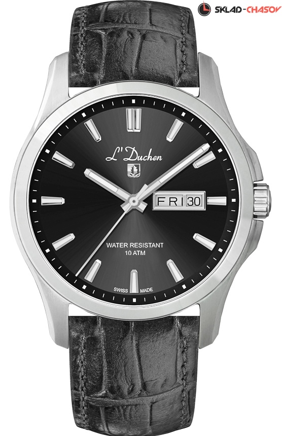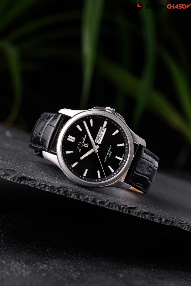 Классические часы со спортивным характером – перед вами новая модель серии Dynamique в кварцевым механизмом Ronda. Ее корпус сделан из нержавеющей стали с гипоаллергенными свойствами. Матирование подчеркивает сложную конструкцию корпуса, в которой предусмотрена дополнительная защита для рельефной заводной головки. Черный циферблат украшен полировкой в виде солнечных лучей, исходящих из центра. Стрелки часов и минут и риски с люминесцентным покрытием Superluminova позволяют легко определить время даже в темноте. Окошко даты и дня недели визуально выделено стальной окантовкой. Циферблат часов защищен сапфировым стеклом. Повышенная водостойкость составляет 10 атмосфер. Ремешок модели сделан из натуральной кожи черного цвета, на него установлена удобная в использовании застежка-клипса с логотипом бренда L’Duchen. Эти часы – надежный и стильный аксессуар, который будет уместен в любой ситуации: и на деловой встрече, и на дружеской вечеринке.