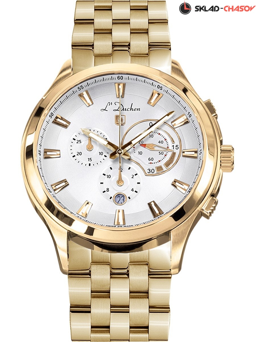 В часах установлен надежный швейцарский механизм с функциями: часы, минуты, секунды, дата, хронограф. Корпус часов изготовлен из гипоаллергенной нержавеющей стали 316L с PVD-покрытием из желтого золота. Размер корпуса 43 мм. Белый циферблат создает впечатление глубины и объема, благодаря «колодцу» по внутреннему краю с нанесенной секундной разметкой. По краю циферблата и каждого из индикаторов выполнено гильоше в виде концентрических колец. Дизайн счетчиков, расположенных на циферблате, напоминает приборную панель самолета. Индексы часов выполнены в необычной форме трапеции. Крупные часовая и минутная стрелки хорошо читаются, они, как и риски, покрыты люминесцентным составом SuperLumiNova, известным насыщенностью и продолжительностью свечения. Циферблат надежно защищен прочным и устойчивым к царапинам сапфировым стеклом с антибликовым покрытием. Кнопки хронографа и заводная головка рельефные, что делает их использование удобным и практичным. Водостойкость в часах 10 атмосфер.