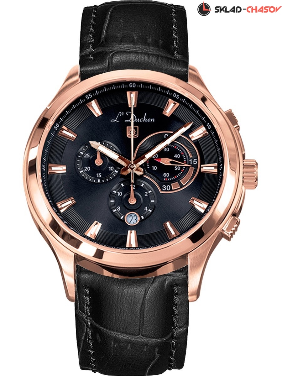 В часах установлен надежный швейцарский механизм с функциями: часы, минуты, секунды, дата, хронограф. Корпус часов изготовлен из гипоаллергенной нержавеющей стали 316L с PVD-покрытием из розового золота. Размер корпуса 43 мм. Черный циферблат создает впечатление глубины и объема, благодаря «колодцу» по внутреннему краю с нанесенной секундной разметкой. По краю циферблата и каждого из индикаторов выполнено гильоше в виде концентрических колец. Дизайн счетчиков, расположенных на циферблате, напоминает приборную панель самолета. Индексы часов выполнены в необычной форме трапеции. Крупные часовая и минутная стрелки хорошо читаются, они, как и риски, покрыты люминесцентным составом SuperLumiNova, известным насыщенностью и продолжительностью свечения. Циферблат надежно защищен прочным и устойчивым к царапинам сапфировым стеклом с антибликовым покрытием. Кнопки хронографа и заводная головка рельефные, что делает их использование удобным и практичным. Водостойкость в часах 10 атмосфер.
