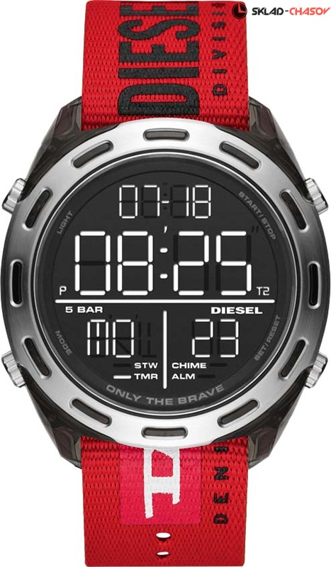 Мужские часы-хронограф с секундомером от Diesel с цифровым отображением времени. 12-ти и 24-х часовой формат времени. Корпус из нейлонового волокна со стальным безелем. Матовый черный циферблат. Ремешок с классической застежкой. Гарантия 2 года.
