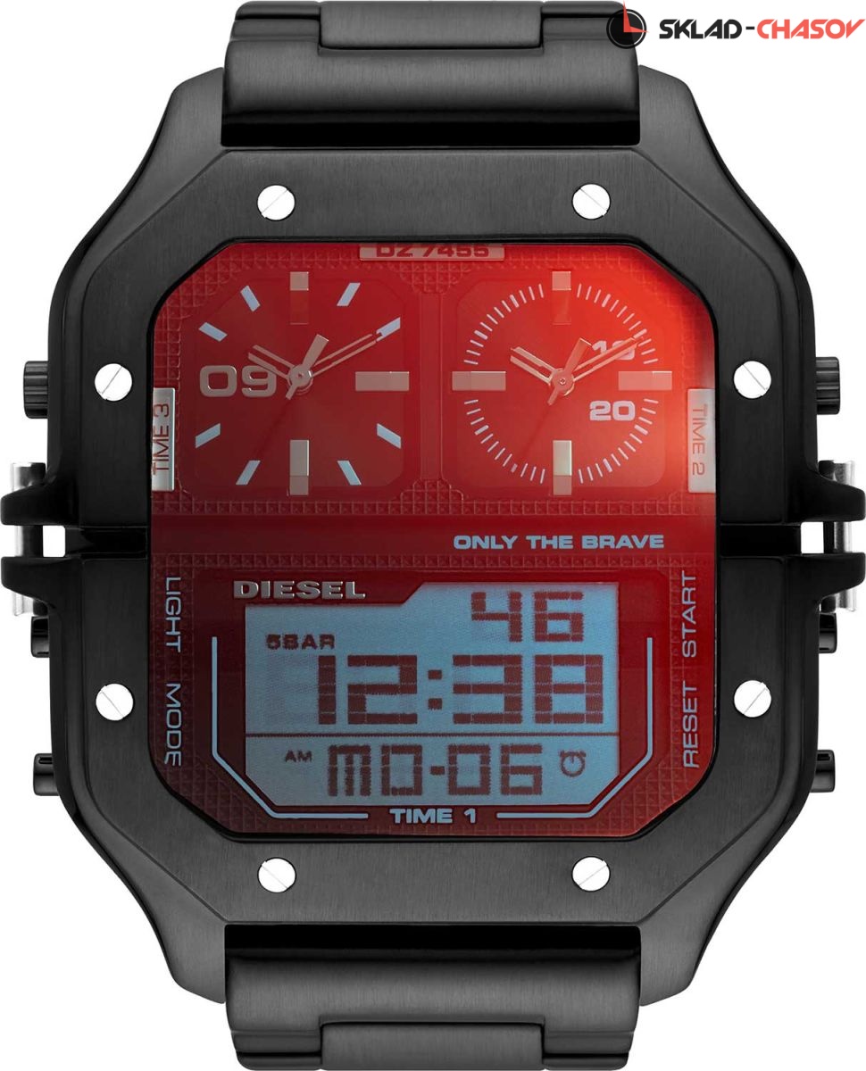 Мужские наручные часы-хронограф DIesel Clasher с двумя аналоговыми циферблатами в дополнении к цифровому. 12-ти и 24-х часовой формат отображения времени. Три механизма, три часовых пояса. Сегментный инвертированный дисплей отображает текущее время с секундами, дату и недели постоянно. Функция будильника. Задняя крышка крепится на винтах. Браслет с раскладывающейся застежкой.Гарантия 2 года. Функции: Будильник. Второй часовой пояс. Секундомер. День недели. Число. Комплектация: Часы, фирменная упаковка, фирменный пакет, инструкция на русском языке, заполненный гарантийный талон. Бренд Diesel Пол Мужские Страна Италия Коллекция Clasher Вид механизма Кварцевые часы Тип браслета/ремешка Нержавеющая сталь Корпус Нержавеющая сталь Стекло Минеральное Водозащита WR 50 Цвет браслета/ремешка Черный Подсветка Дисплея, стрелок Ширина мм 58 мм. Высота мм 64 мм. Толщина мм 13.5 мм. Артикул DZ7455
