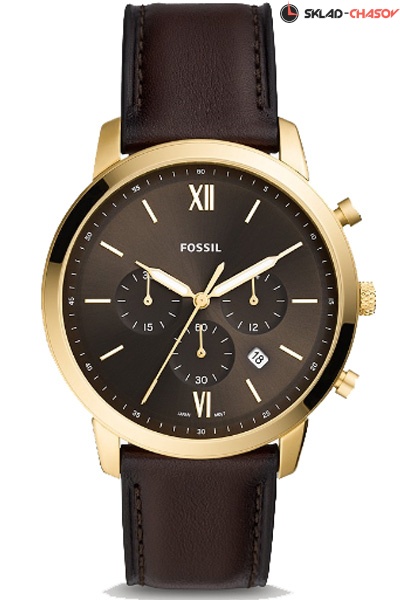 Мужские кварцевые наручные часы с хронографом (секундомером) Fossil FS5763 коллекции Neutra. Секундомер может отсчитывать до 30 минут. На данной модели отображается время суток (24-х часовая шкала). Кожаный ремешок. На корпус нанесено стойкое PVD покрытие. Водонепроницаемость WR50 (5 атм).