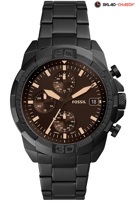 Мужские кварцевые наручные часы с хронографом (секундомером) Fossil FS5851 коллекции Bronson Chronograph. Секундомер может отсчитывать до 30 минут. На данной модели отображается дата и время суток (24-х часовая шкала). Стальной браслет. На корпус и браслет нанесено стойкое PVD покрытие. Водонепроницаемость WR50 (5 атм).
