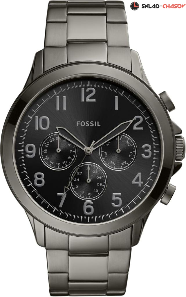 Мужские наручные часы Fossil в круглом стальном корпусе. Число и день недели отображаются на отдельных циферблатах. 12-ти и 24-х часовой формат времени. Заводная головка с защитой. Браслет с раскладывающейся застежкой.Гарантия 2 года.
