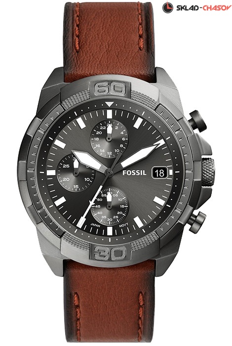 Мужские кварцевые наручные часы с хронографом (секундомером) Fossil FS5855 коллекции Bronson Chronograph. Секундомер может отсчитывать до 30 минут. На данной модели отображается дата и время суток (24-х часовая шкала). Кожаный ремешок. На корпус нанесено стойкое PVD покрытие. Водонепроницаемость WR50 (5 атм).